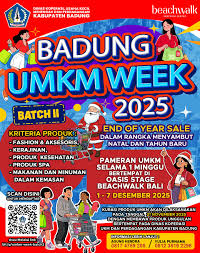 Pemerintah Kabupaten Badung, melalui Dinas Koperasi, Usaha Kecil dan Menengah, dan Perdagangan (Diskop UKMP) Badung, kembali menunjukkan komitmennya dalam memajukan pelaku usaha lokal. Menyambut momen Natal dan Tahun Baru, pameran “Badung UMKM Week 2025 – Batch II” siap digelar sebagai agenda End of Year Sale terbesar yang menampilkan produk-produk unggulan UMKM Bali.