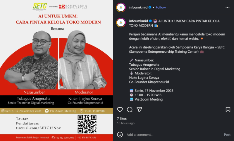 Sampoerna Entrepreneurship Training Center (SETC) kembali menggelar pelatihan bagi pelaku Usaha Mikro, Kecil, dan Menengah (UMKM) melalui sebuah webinar bertajuk “AI UNTUK UMKM: CARA PINTAR KELOLA TOKO MODERN”. Pelatihan ini bertujuan untuk membekali para pemilik UMKM dengan pengetahuan dan keterampilan dalam memanfaatkan kecerdasan buatan (Artificial Intelligence atau AI) agar dapat mengelola toko modern secara lebih efisien, efektif, dan hemat waktu.